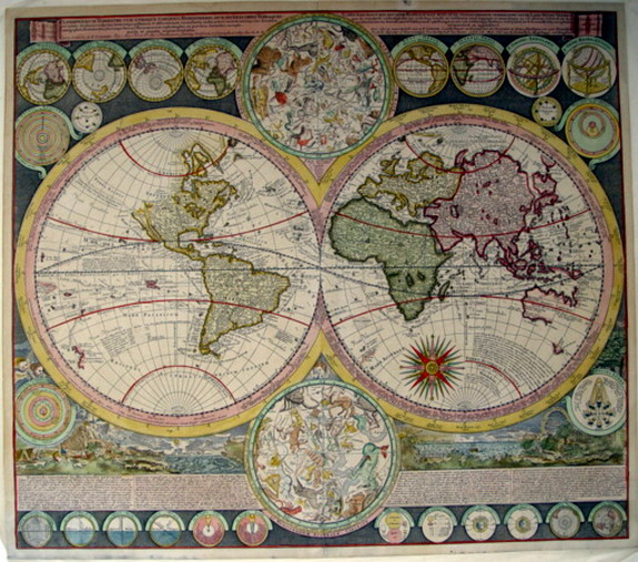 A fine copy of Zurner's complex and very informative World Map Published by the Amsterdam Publisher Peter Schenk, this map taken from his "Atlas Contractus" The Double Hemisphere is cartographically up to date. Encircling the hemispheres are markings of the winds and climates ,and set around the border there are 26 (!!) smaller astronomical diagrams and hemispheres of the World according to different projections. In addition there are 2 larger Celestial Hemispheres, and at the bottom a panoramic view illustrating tempests, earthquakes, tides etc. Beneath there's a lengthy commentary on the natural phnomena depicted. A beautiful most decorative map. See:(at length) Shirley; plate 440, entry: 639. [being the last map to be incorporated in this priceless reference tool]